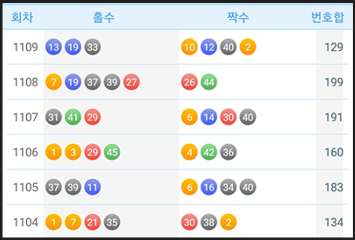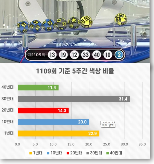 당첨번호 색상 비율 자료는 1110회 로또 예상번호 선택에 있어 30번대와 1번대에서 최소 1-2개의 번호를 포함하는 것이 유리할 수 있음을 의미합니다.