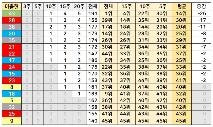 예를 들어 최근 3주나 5주 출현 횟수와 전체 누적 횟수, 그리고 기간별 평균 출현 순위를 비교해가면서 유력 후보군을 가려낼 수 있죠.