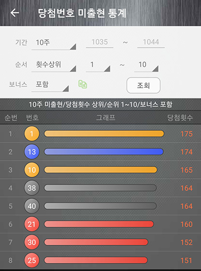 5주간 미출현 번호 중에서 당첨횟수를 체크할 수 있습니다.