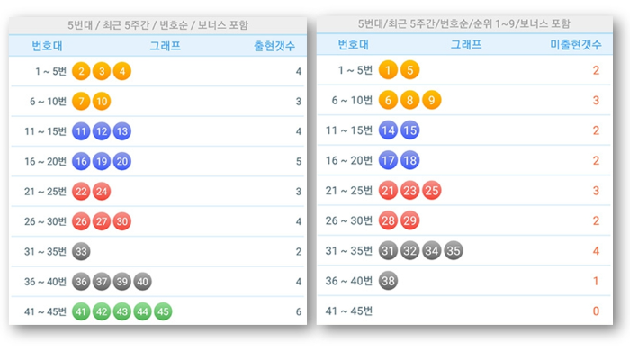 최근 5주간의 당첨 번호 색상 비율과 미출현 번호 분석을 통해, 덜 자주 나온 번호대에 대한 주의도 필요합니다.