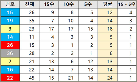 15주 대비 5주 로또번호 출현 순위 증감표에서 변동 없는 번호들입니다.
