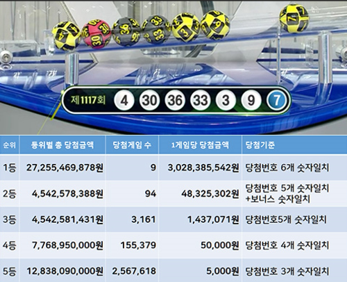 로또 1117회에서는 당첨번호 3, 4, 9, 30, 33, 36이 추첨되었으며, 보너스 번호로는 7이 선정되었습니다. 이번 추첨에서는 1등 당첨자 9명이 각각 30억 원의 당첨금을 받았으며, 2등 94명은 각 4천8백만 원의 당첨금을 받았습니다.