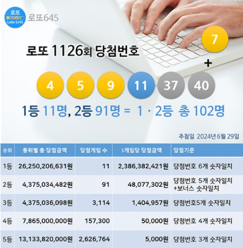 1126회 로또 당첨번호는 4, 5, 9, 11, 37, 40으로, 보너스 번호는 7이었습니다. 이번 회차에서는 홀수 5개, 짝수 2개로 홀수의 비율이 높았습니다.