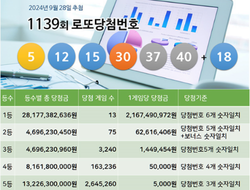 1139회 로또 당첨 번호를 자세히 살펴보고, 자주 나오는 번호들은 어떤 것들인지 알아볼 거예요. 이를 기준으로 1140회 로또 예상 번호도 함께 고민해 볼게요. 로또 1139회 당첨번호는 5, 12, 15, 30, 37, 40이었고, 보너스 번호는 18이었답니다. 1등 당첨자는 13명이나 되었고, 1인당 당첨금액은 약 21억 6천만원이었어요.