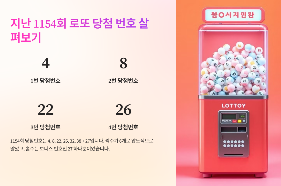 1154회 당첨번호는 4, 8, 22, 26, 32, 38 + 27입니다. 이번 회차의 특징은 짝수가 6개로 압도적으로 많았고, 홀수는 보너스 번호인 27 하나뿐이었습니다.