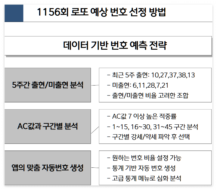 이제 본격적으로 1156회 예상 번호를 살펴볼게요. 이번에는 5주간 출현과 미출현 비율, 그리고 자주 나온 번호들을 조합해 몇 개 추려봤어요. 핵심은 1155회에서 확인된 흐름을 그대로 가져가면서, 미출현 쪽도 놓치지 않는 균형을 잡았다는 점이에요.