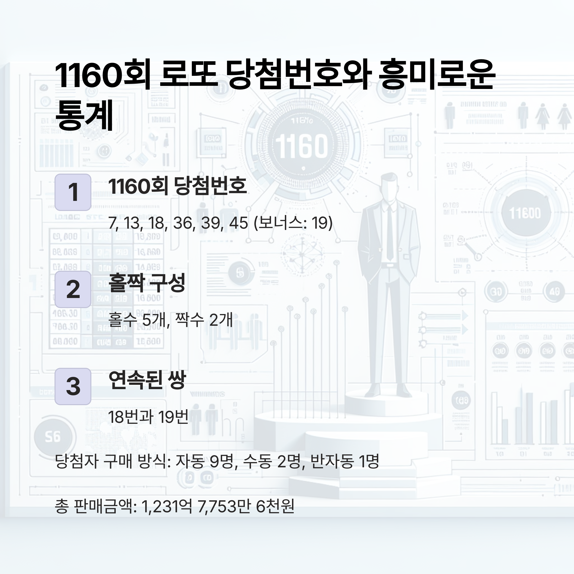1160회 당첨번호는 홀수 5개(7, 13, 19, 39, 45), 짝수 2개(18, 36)로 구성되었습니다.