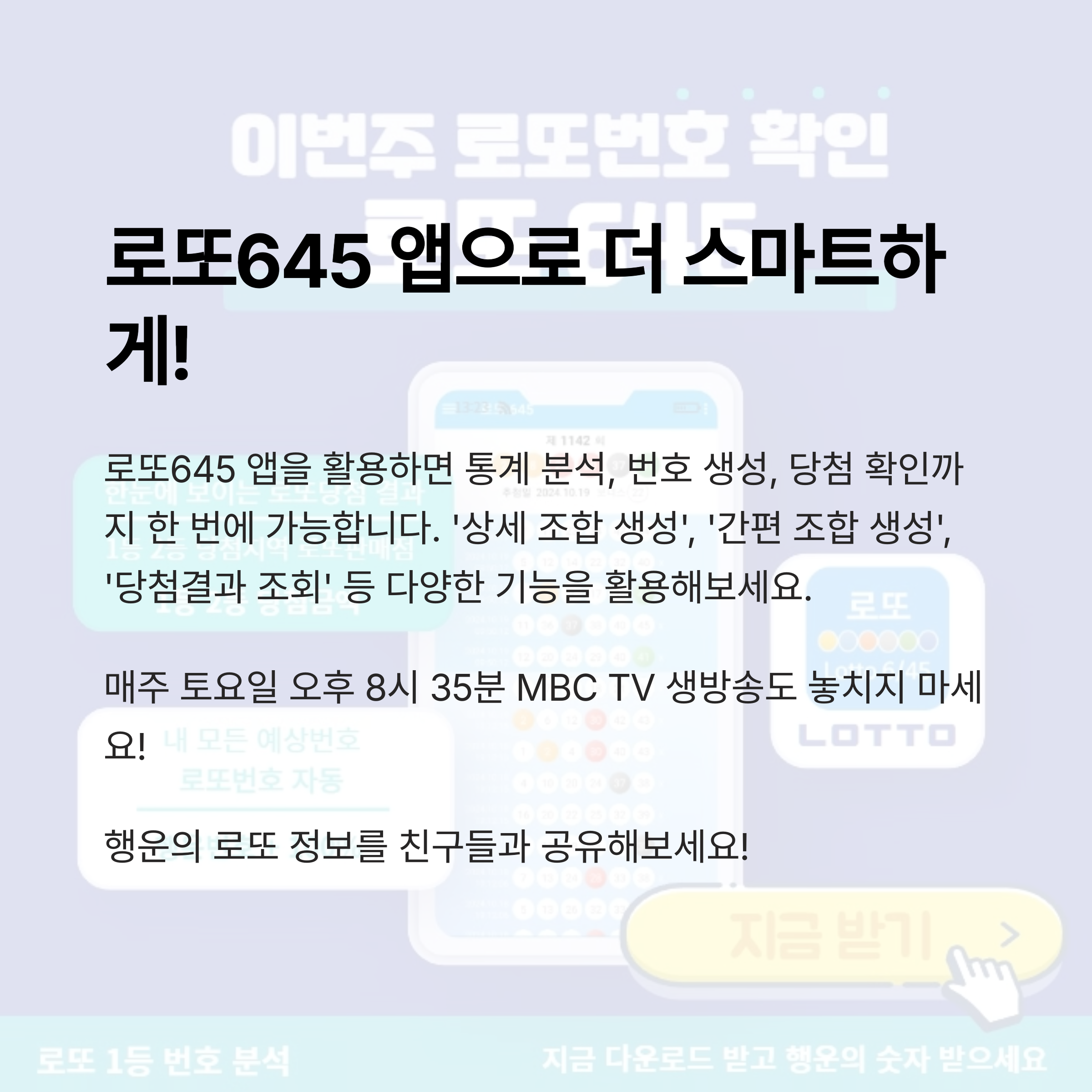 매주 토요일 오후 8시 35분 MBC TV에서 생방송으로 진행되는 로또 추첨 방송도 놓치지 말고 확인해보세요. 로또645 앱에서는 추첨 직후 바로 당첨번호가 업데이트되어 편리하게 확인할 수 있어요.