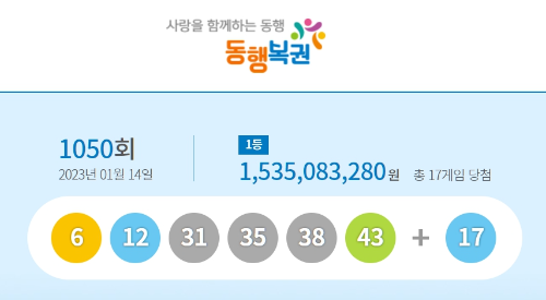 로또 1050회 1등 당첨번호 발표와 당첨결과 1등 17명은 1인당 15억원씩 당첨금으로 받게 되었고, 2등은 70명으로 6천2백만원씩 수령하게 되었다는 소식입니다.