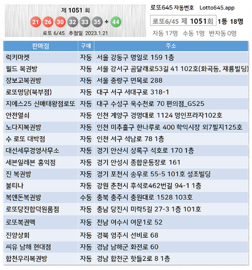 로또 1052회 당첨 예상번호 받았다! 1051회 로또 1등 당첨번호 적중 내용