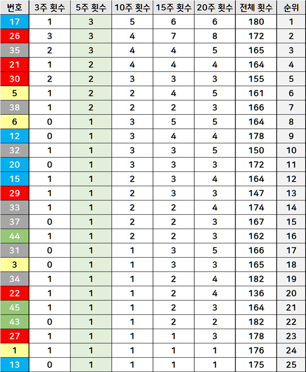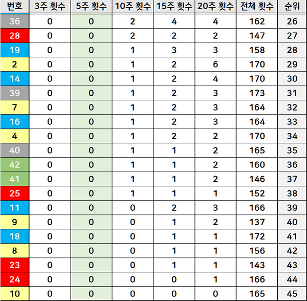 5주 기간 동안 한번이라도 당첨 되었던 번호들이 있고, 5주 동안 당첨횟수가 없는 미출현 번호도 보입니다.