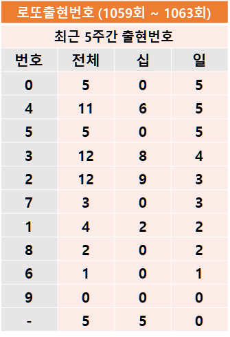 1059회 ~ 1063회 5주간 당첨된 번호를 조사했습니다.