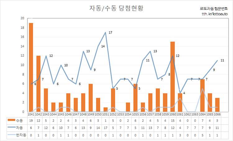로또 1067회 당첨 예상 번호 분석에 1066회 로또 1등 자동 11명 수동 3명 반자동 1명 구매방식이 파악되어 여전히 로또번호를 직접 선택하는 수동 구매가 당첨확률 높다는 것을 확인했습니다.
