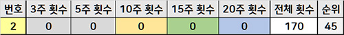 어떤 번호들이 당첨되지 않았는지 파악하였고, 아래 표에서 기간별 횟수에 0으로 표시된 숫자가 그 기간에서 당첨되지 못한 번호입니다.