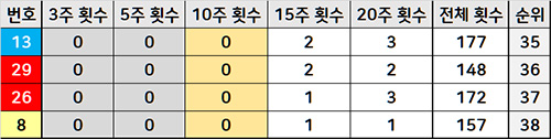 어떤 번호들이 당첨되지 않았는지 파악하였고, 아래 표에서 기간별 횟수에 0으로 표시된 숫자가 그 기간에서 당첨되지 못한 번호입니다.