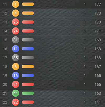 1 ~ 10번대 노랑색 번호들 비율이 높고, 빨강색, 회색 번호들 비율도 높은 편입니다.