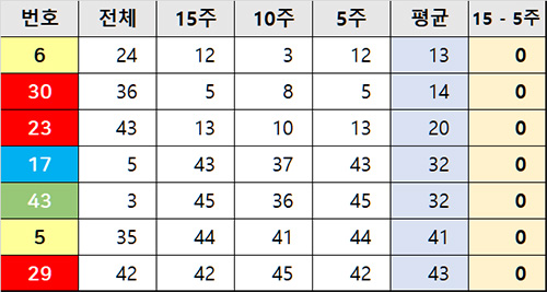 15주 대비하여 5주간 출현 순위도 동일한 번호들입니다.