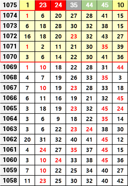 1번 23번 35번입니다. 1069회이전은 5주간 미출현 영역입니다.