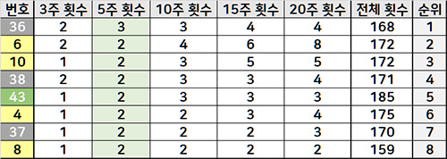 5주간 출현 횟수 기준으로 정렬하여 3회 2회 1회 0회 그룹으로 분류하였습니다.