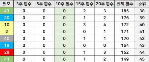 확률상 이러한 번호들은 1089회 제외수로 빼서 로또예상번호에 포함되지 않도록 하는데 유리합니다.