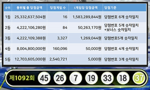 1092회 당첨결과에서 1등은 16명, 2등은 84명, 3등은 3327명으로 집계 되었습니다. 1등은 1인당 16억원씩 받게 되었고, 2등은 1인당 5천만원씩 받게 됩니다.