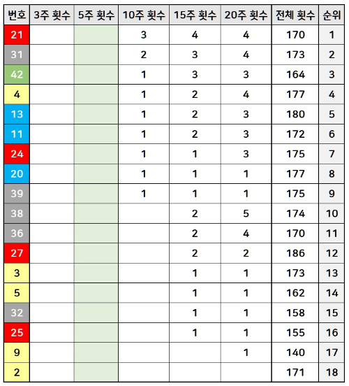 20주 15주 10주 미출현 번호들이 보입니다. 장기간 로또복권에 미당첨된 번호들도 관심을 가져 주세요.