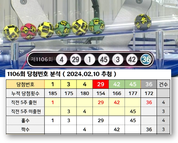 1107회 로또 1등 예상번호는 어떤 조합으로 당첨될까요? 지난 1106회 당첨번호는 지난 5주 출현번호 중에서 4개 번호가 일치되었습니다. 1 29 42 36 번호가 일치되었고, 5주 미출현번호에서는 3 4 45 번호가 일치되었습니다.