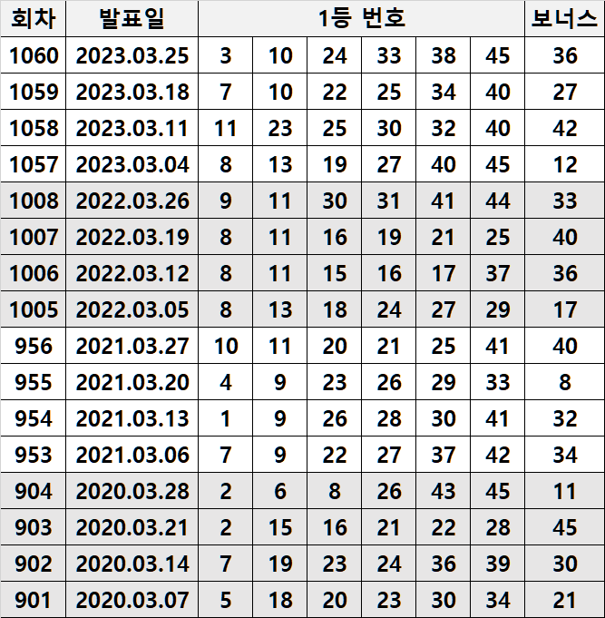 현재까지 3월에만 나왔던 로또 1등 번호와 보너스 번호 내역을 공개하였습니다.