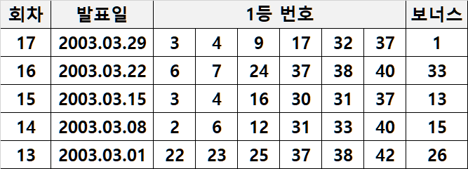 2003년 3월부터 2023년 3월까지 로또당첨번호